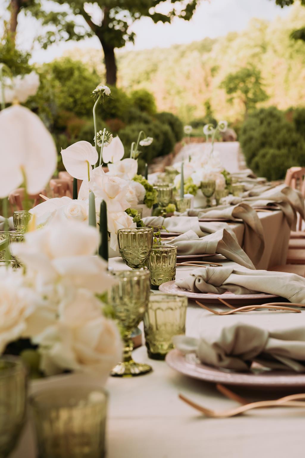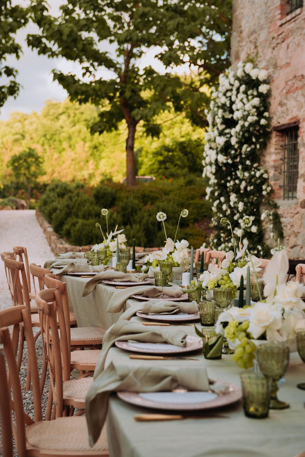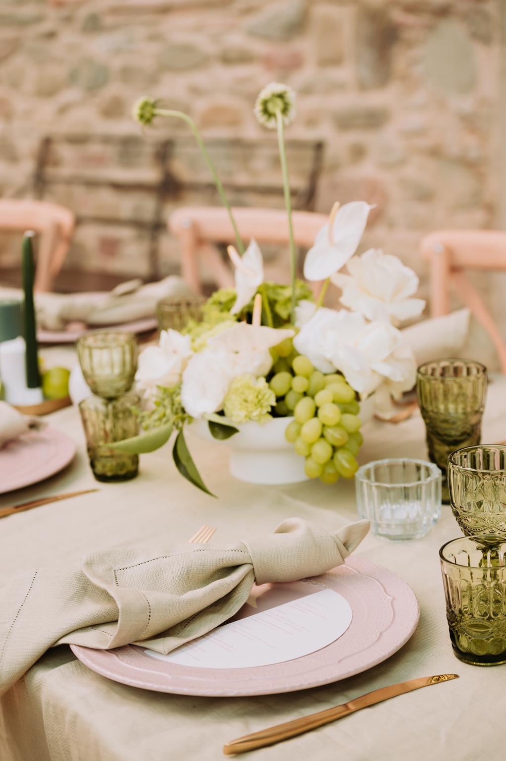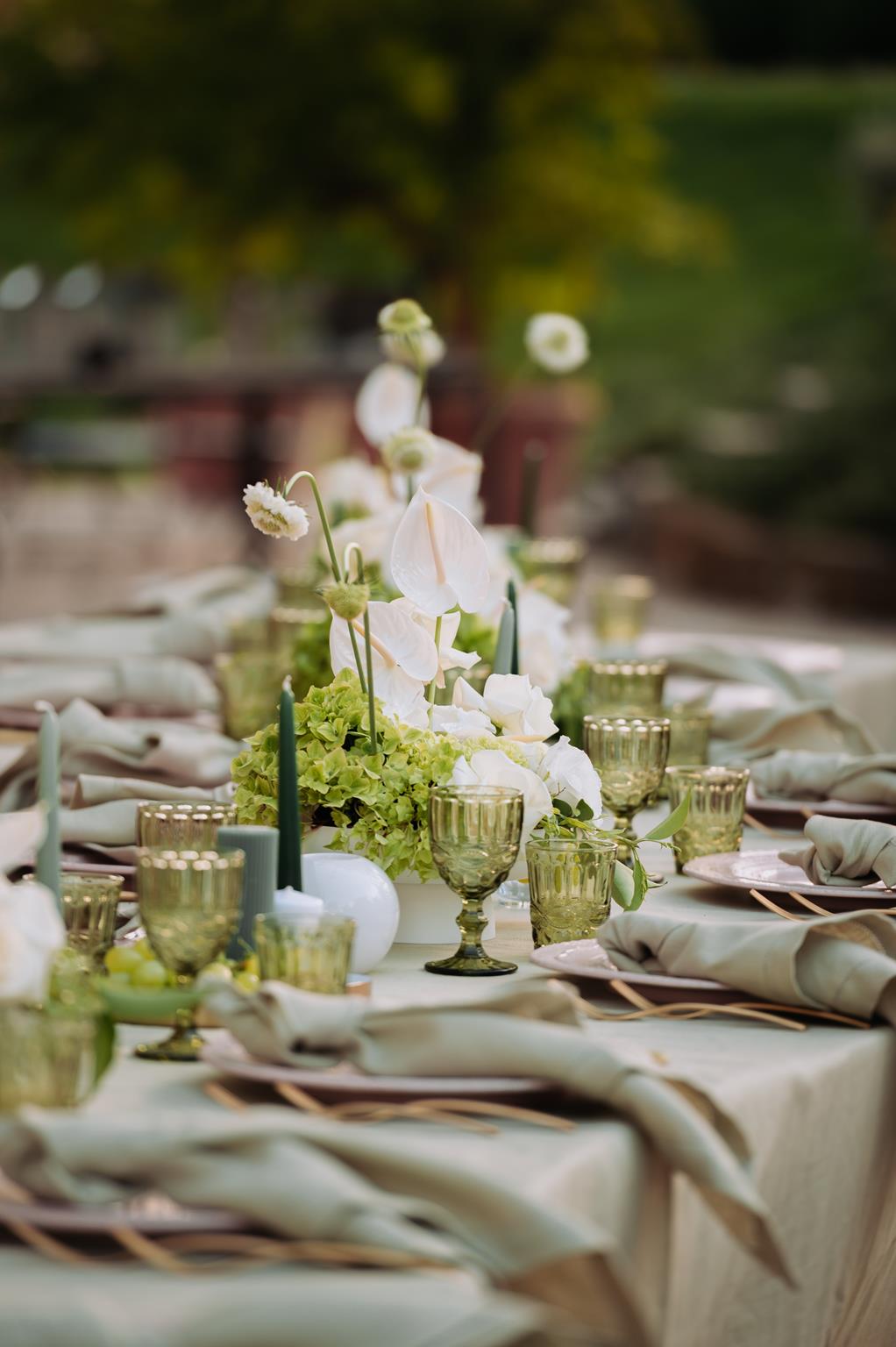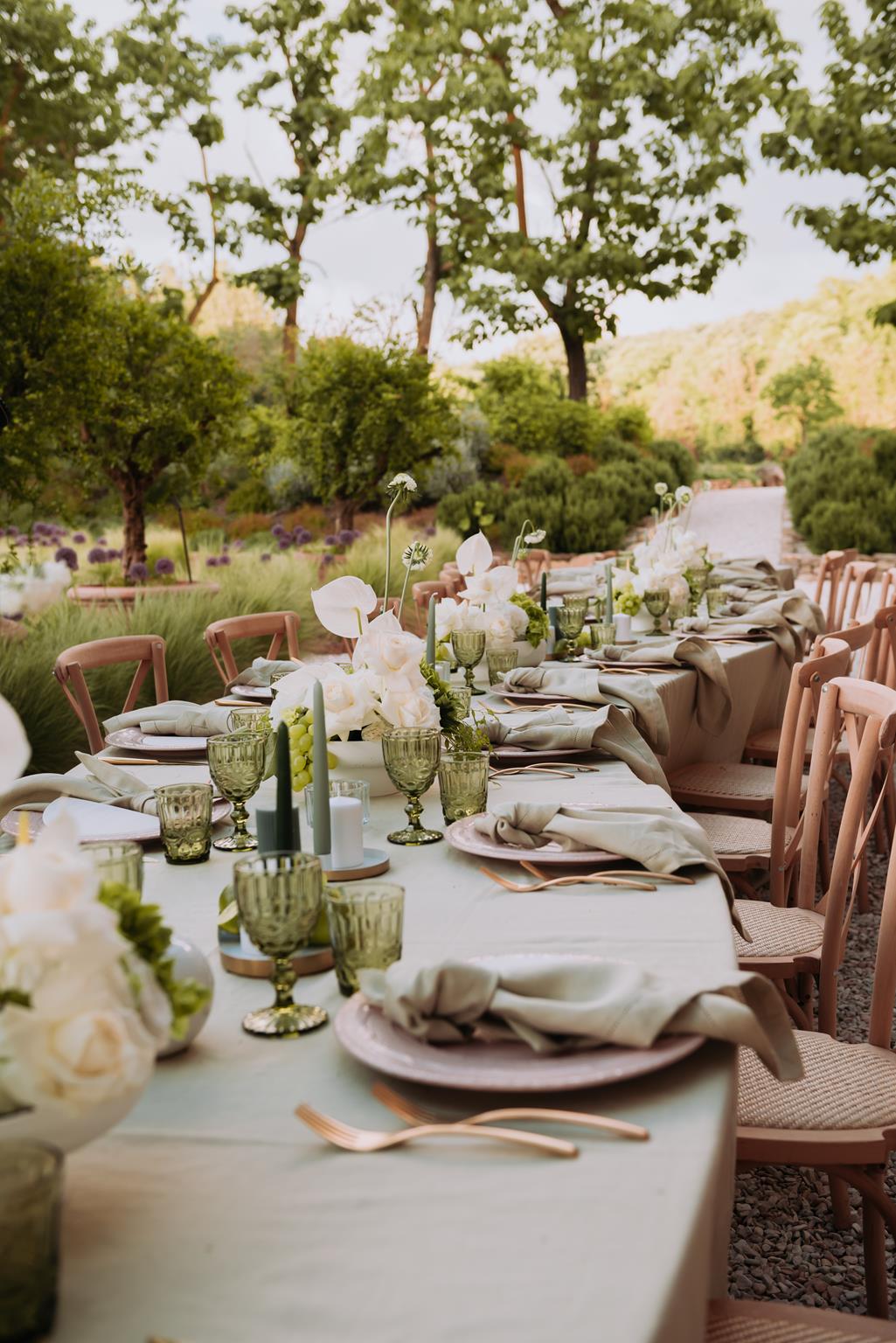 Nella magica cornice di Vocabolo Moscatelli, nel cuore dell’Umbria, questo shooting celebra l’eleganza della semplicità e il fascino della natura. La lunga tavola imperiale allestita all’aperto, tra pietra antica e giardini fioriti, si veste di tonalità delicate — verde salvia, blush e avorio — arricchite da fiori bianchi, uva fresca e vetri verde acqua. Un’atmosfera intima e raffinata, ispirata alla bellezza autentica della campagna umbra, perfetta per gli sposi che desiderano un matrimonio romantico, naturale e senza tempo