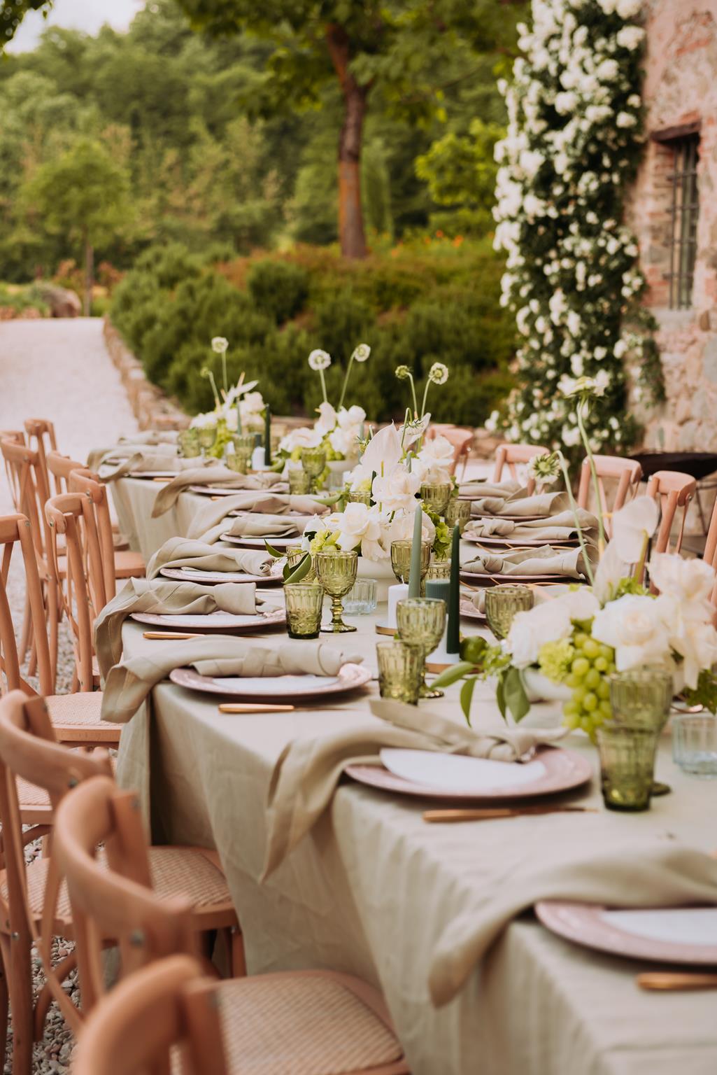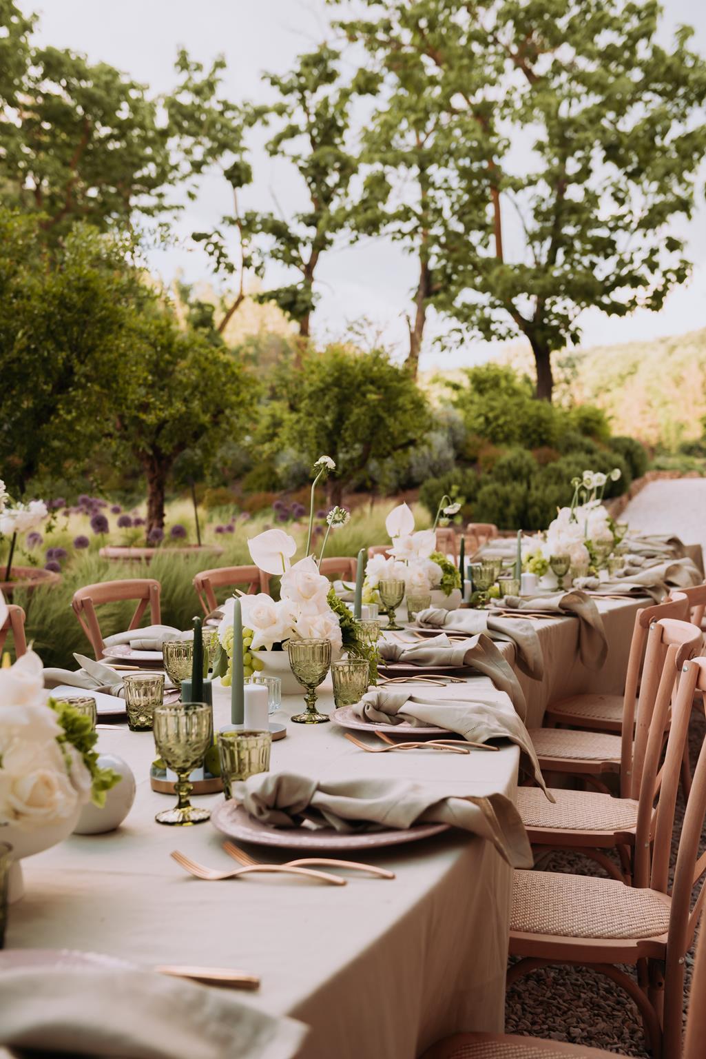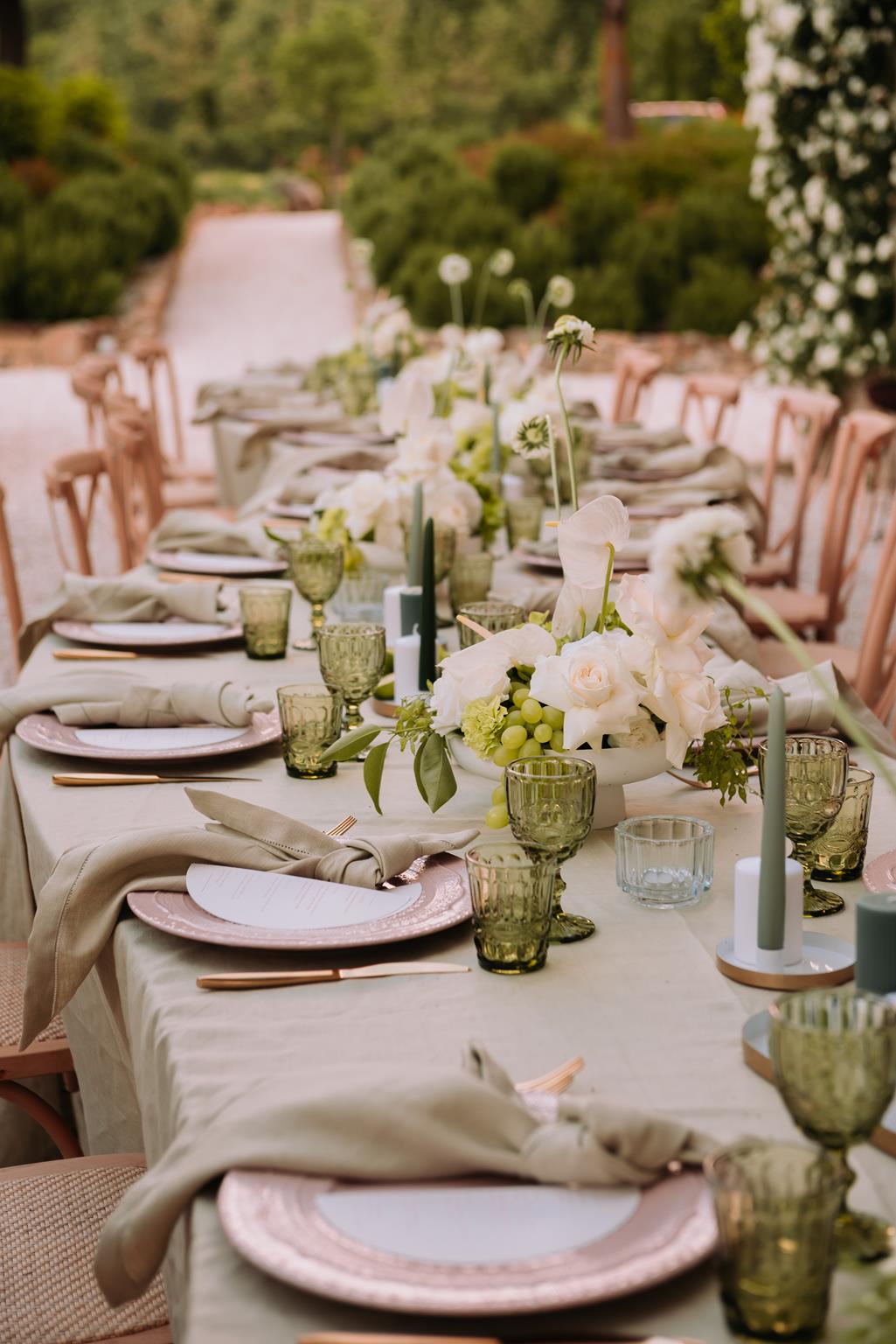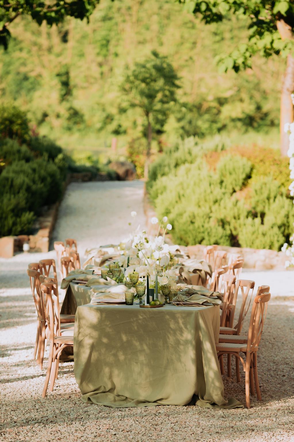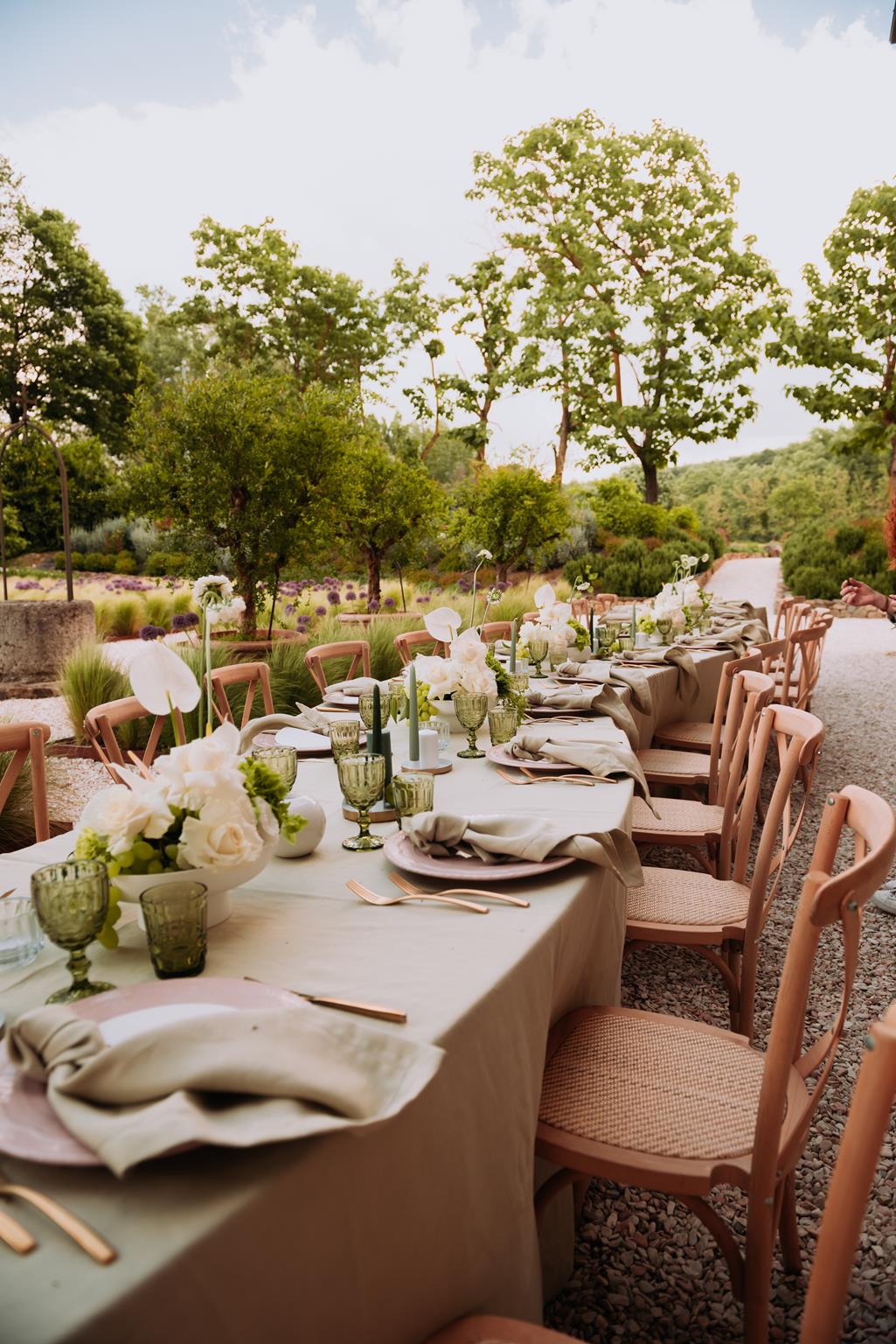 Nella magica cornice di Vocabolo Moscatelli, nel cuore dell’Umbria, questo shooting celebra l’eleganza della semplicità e il fascino della natura. La lunga tavola imperiale allestita all’aperto, tra pietra antica e giardini fioriti, si veste di tonalità delicate — verde salvia, blush e avorio — arricchite da fiori bianchi, uva fresca e vetri verde acqua. Un’atmosfera intima e raffinata, ispirata alla bellezza autentica della campagna umbra, perfetta per gli sposi che desiderano un matrimonio romantico, naturale e senza tempo