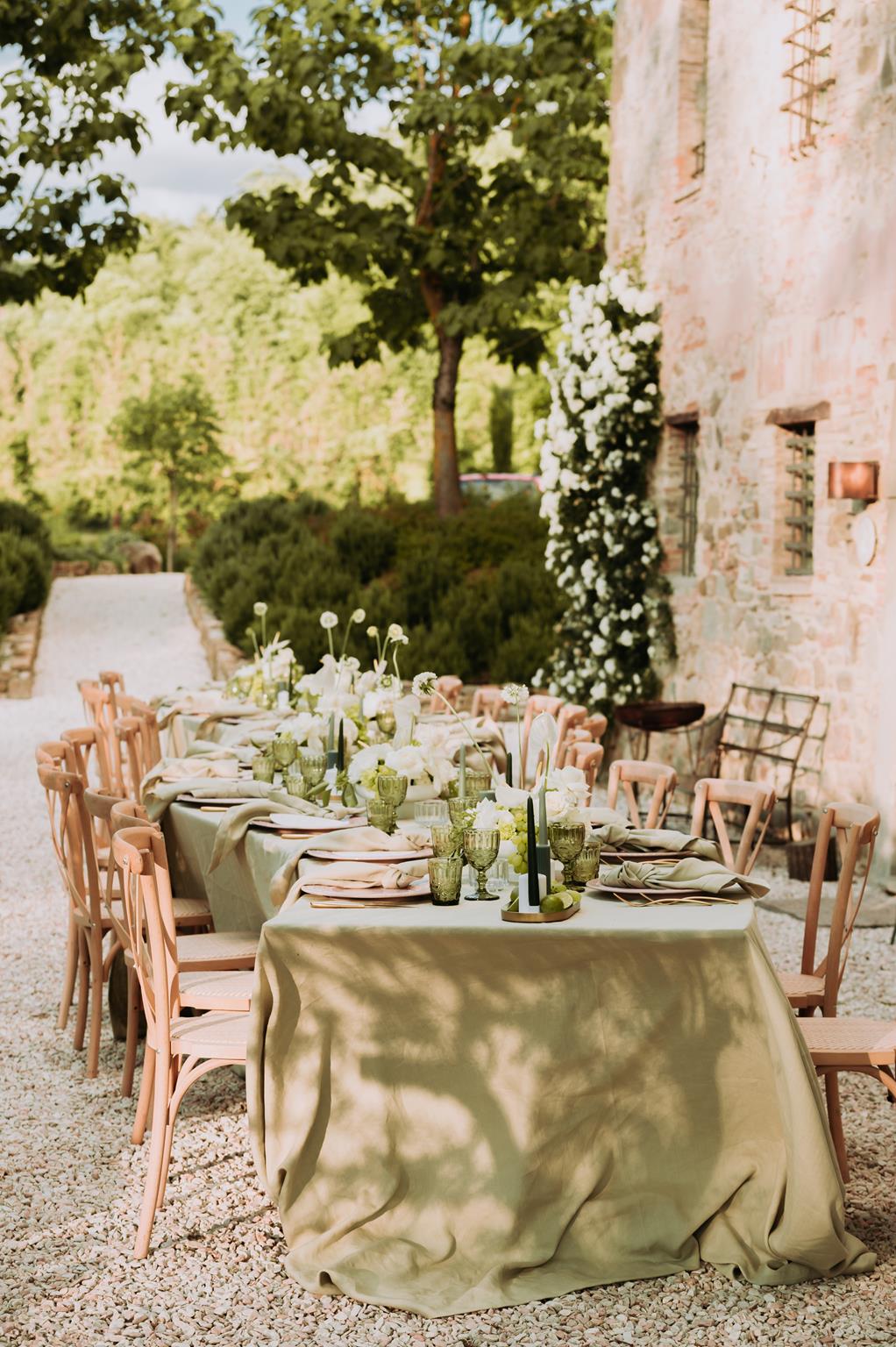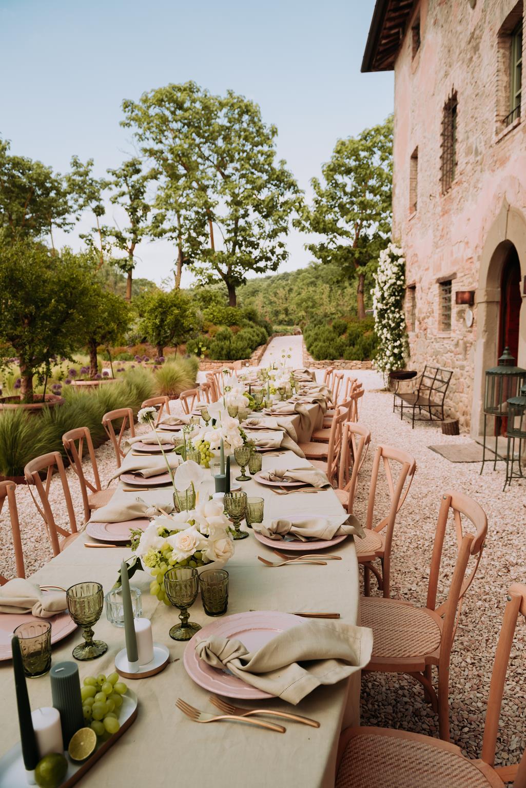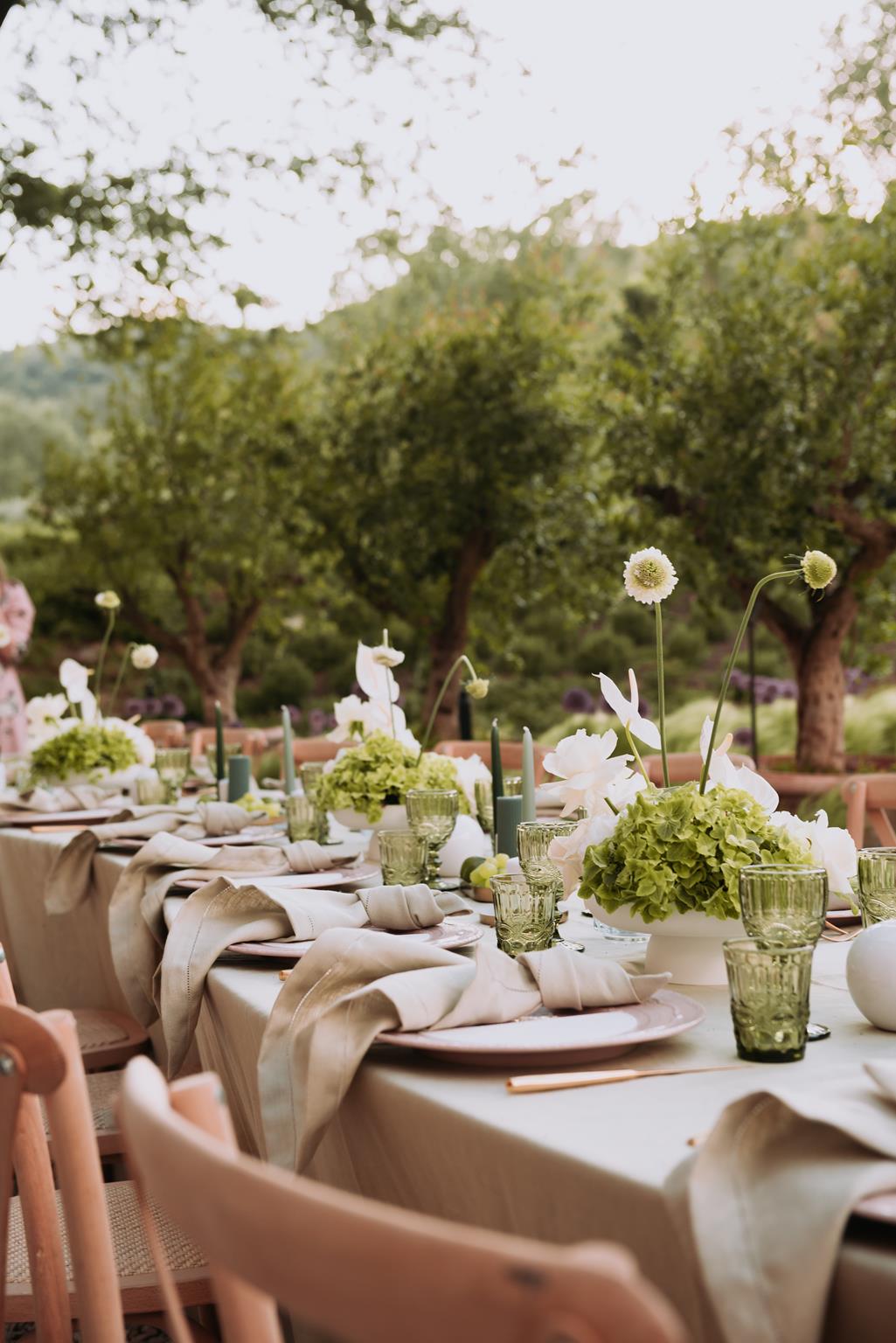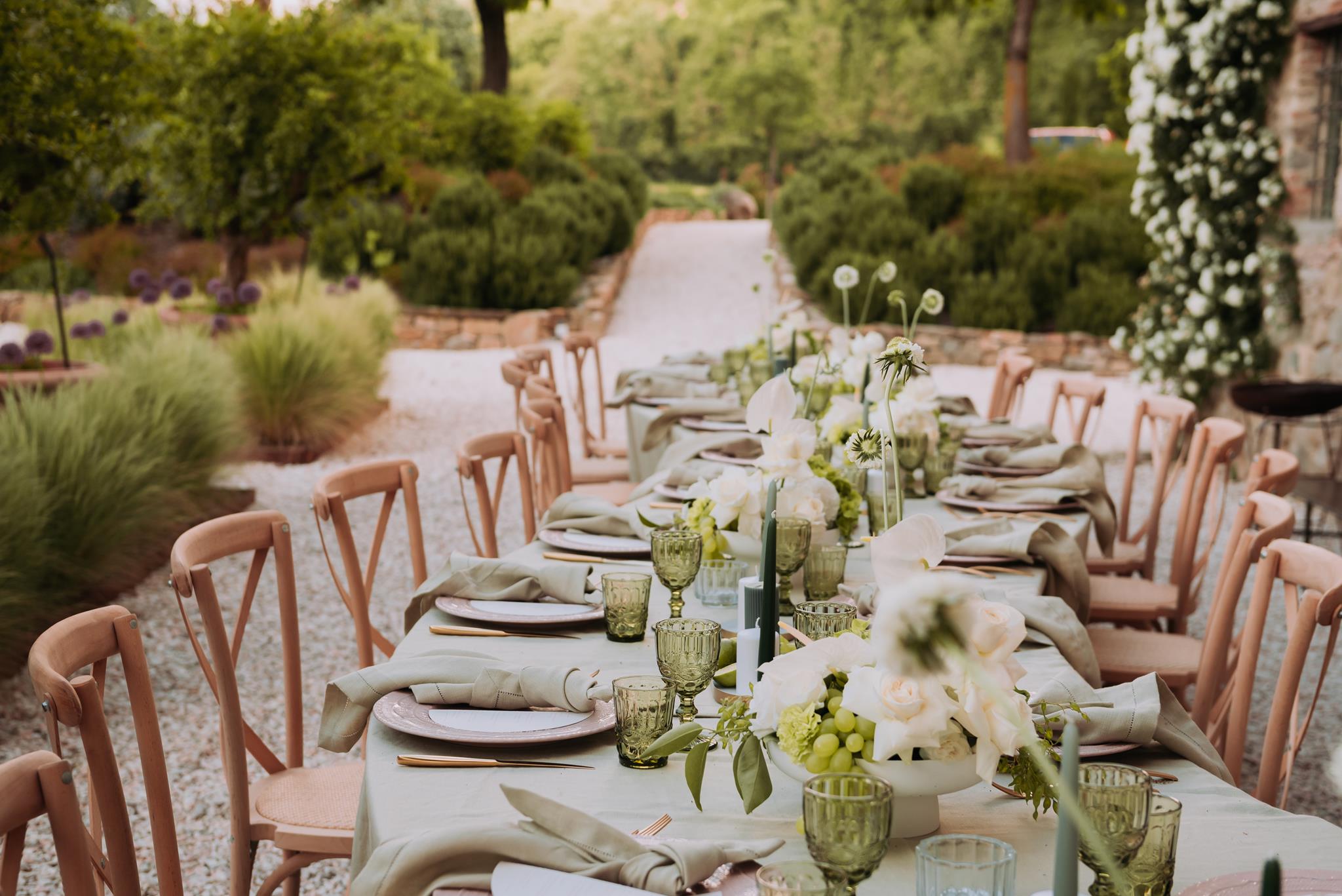 Nella magica cornice di Vocabolo Moscatelli, nel cuore dell’Umbria, questo shooting celebra l’eleganza della semplicità e il fascino della natura. La lunga tavola imperiale allestita all’aperto, tra pietra antica e giardini fioriti, si veste di tonalità delicate — verde salvia, blush e avorio — arricchite da fiori bianchi, uva fresca e vetri verde acqua. Un’atmosfera intima e raffinata, ispirata alla bellezza autentica della campagna umbra, perfetta per gli sposi che desiderano un matrimonio romantico, naturale e senza tempo