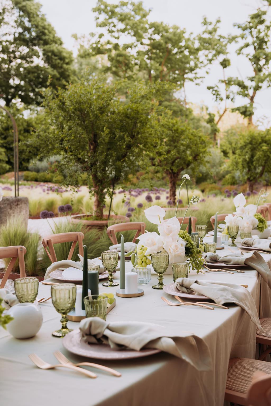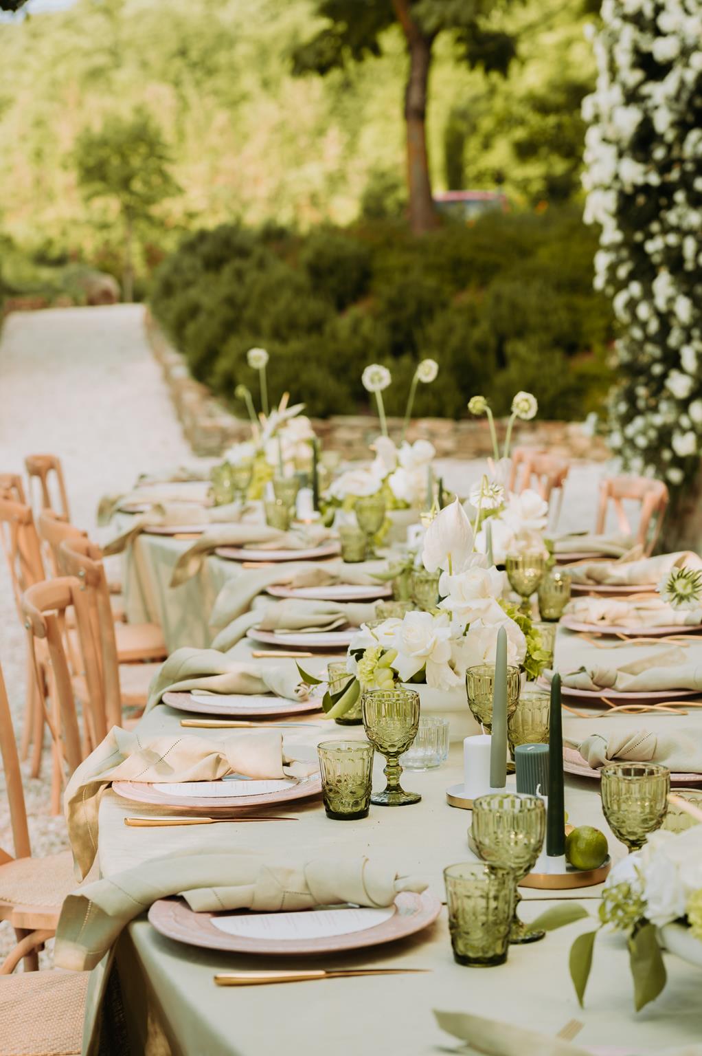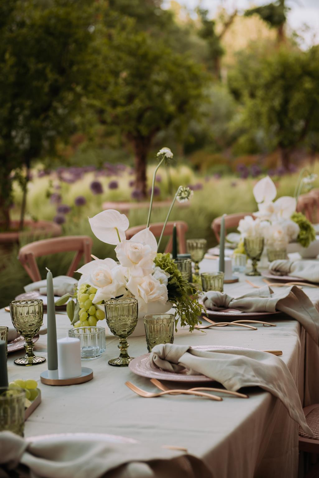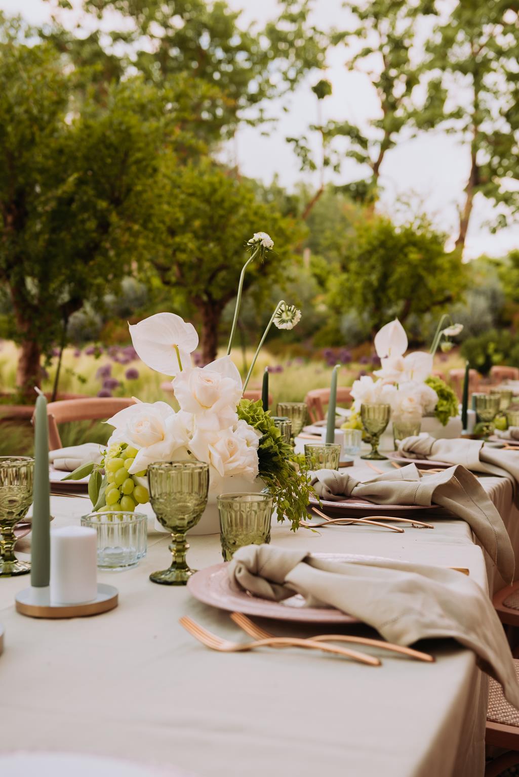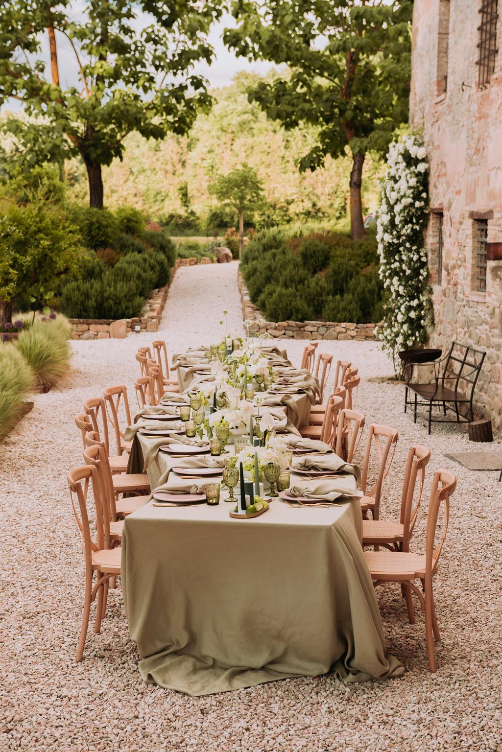 Nella magica cornice di Vocabolo Moscatelli, nel cuore dell’Umbria, questo shooting celebra l’eleganza della semplicità e il fascino della natura. La lunga tavola imperiale allestita all’aperto, tra pietra antica e giardini fioriti, si veste di tonalità delicate — verde salvia, blush e avorio — arricchite da fiori bianchi, uva fresca e vetri verde acqua. Un’atmosfera intima e raffinata, ispirata alla bellezza autentica della campagna umbra, perfetta per gli sposi che desiderano un matrimonio romantico, naturale e senza tempo