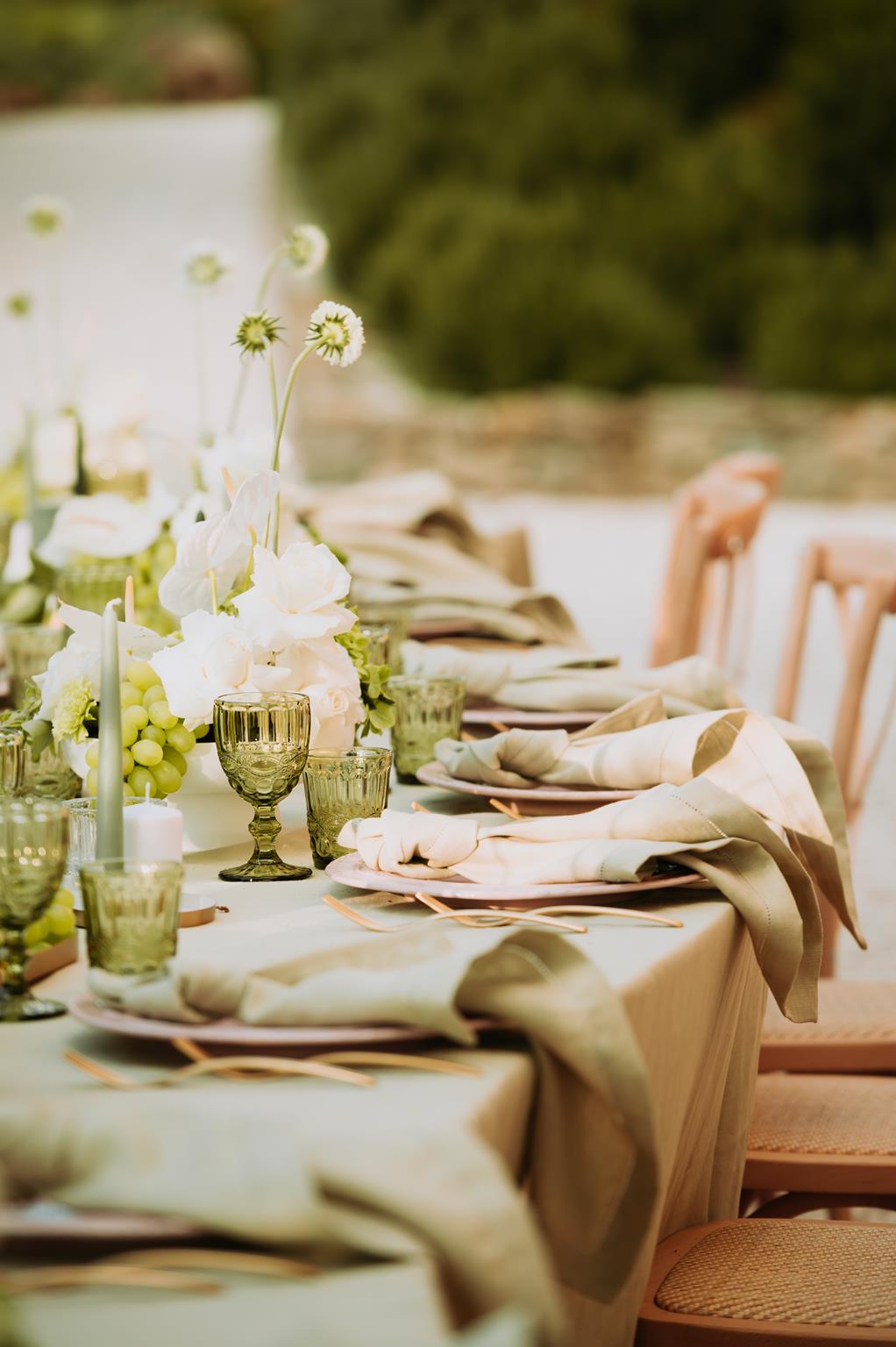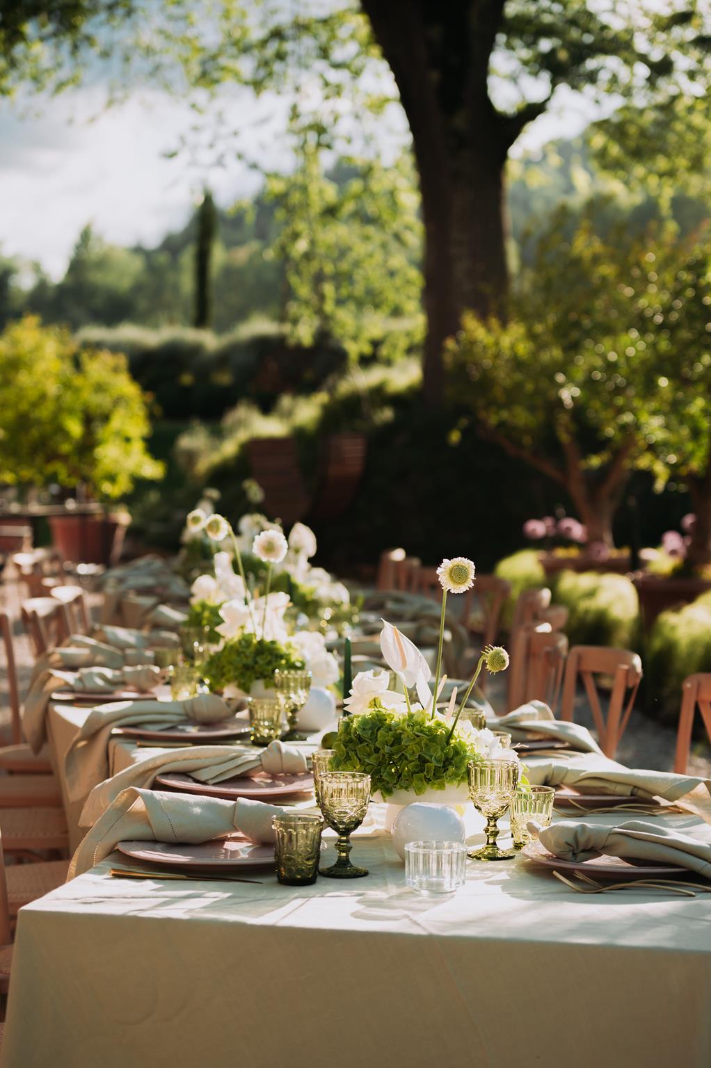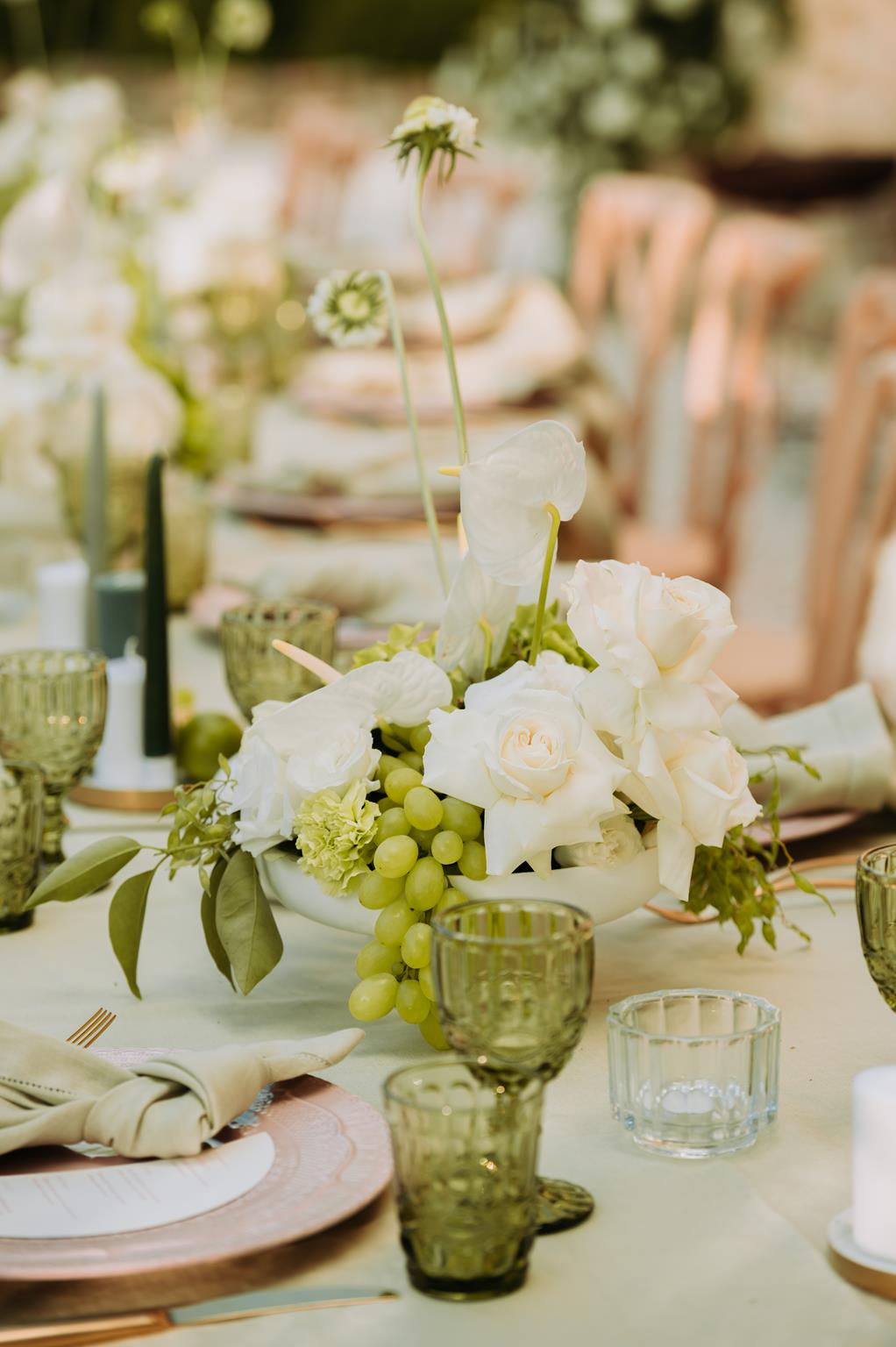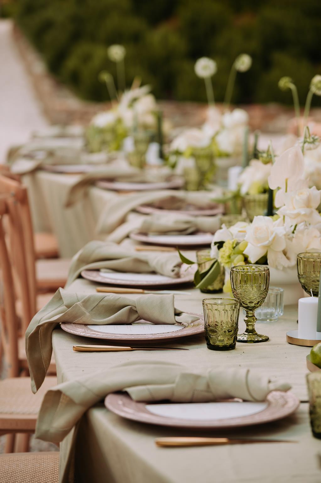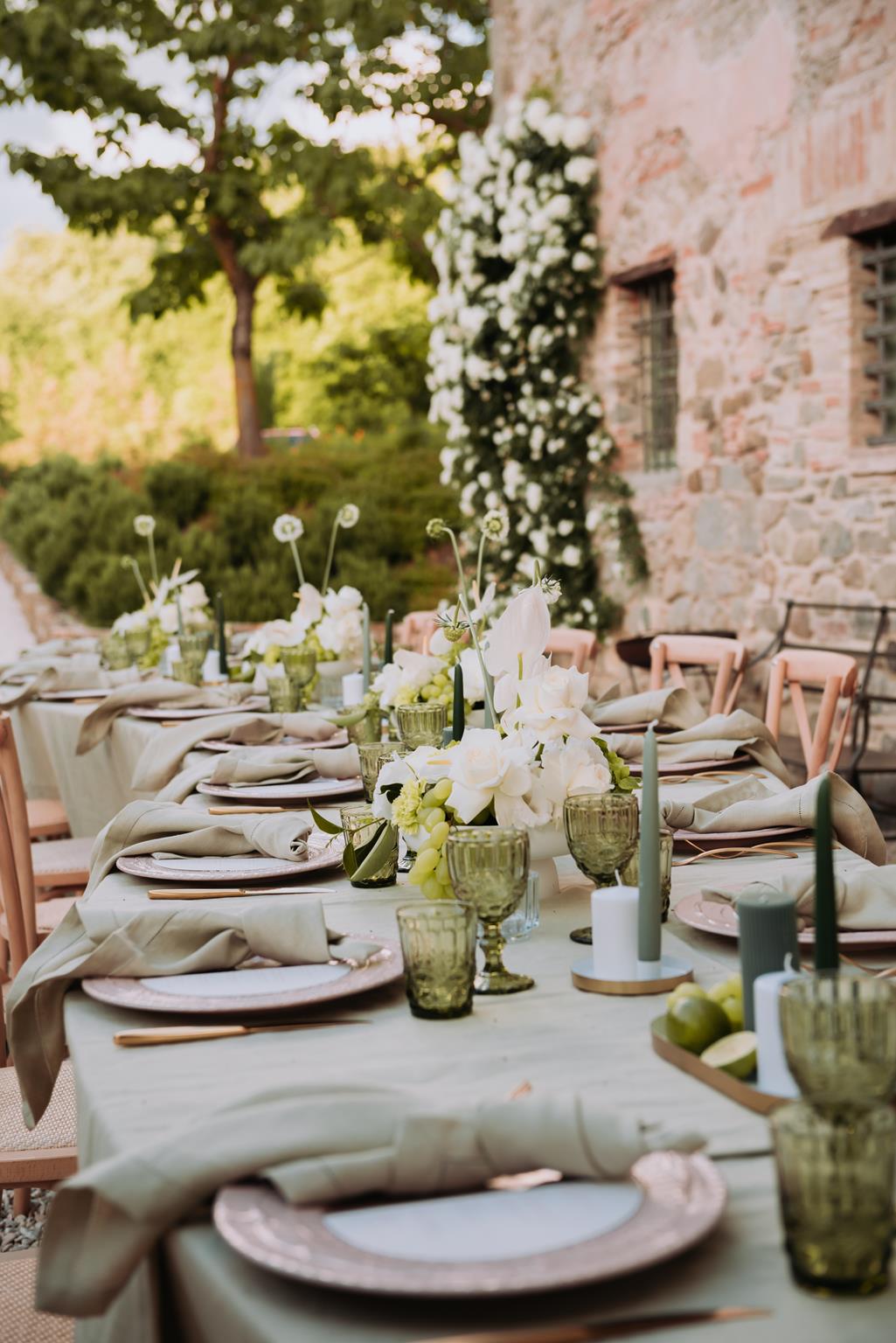 Nella magica cornice di Vocabolo Moscatelli, nel cuore dell’Umbria, questo shooting celebra l’eleganza della semplicità e il fascino della natura. La lunga tavola imperiale allestita all’aperto, tra pietra antica e giardini fioriti, si veste di tonalità delicate — verde salvia, blush e avorio — arricchite da fiori bianchi, uva fresca e vetri verde acqua. Un’atmosfera intima e raffinata, ispirata alla bellezza autentica della campagna umbra, perfetta per gli sposi che desiderano un matrimonio romantico, naturale e senza tempo