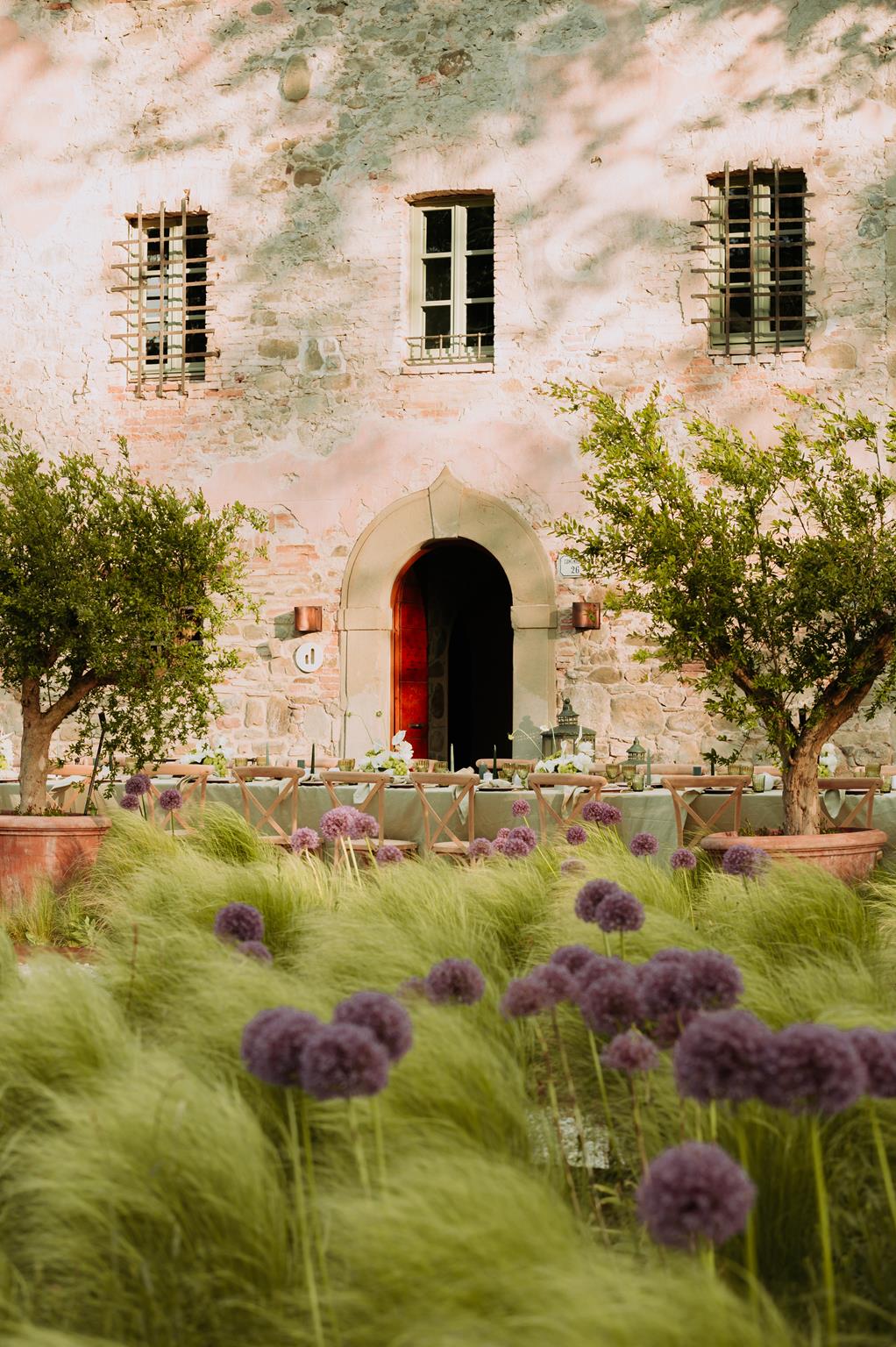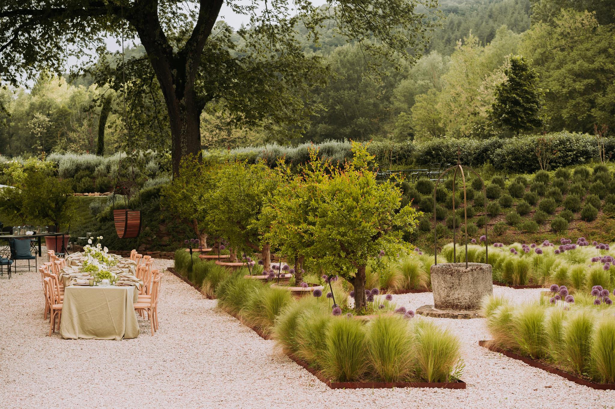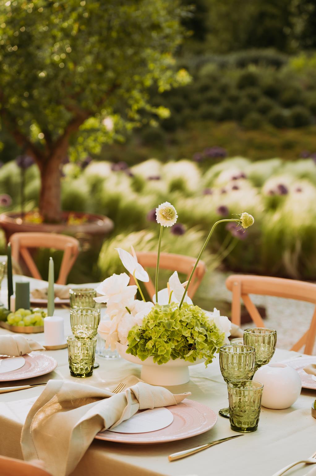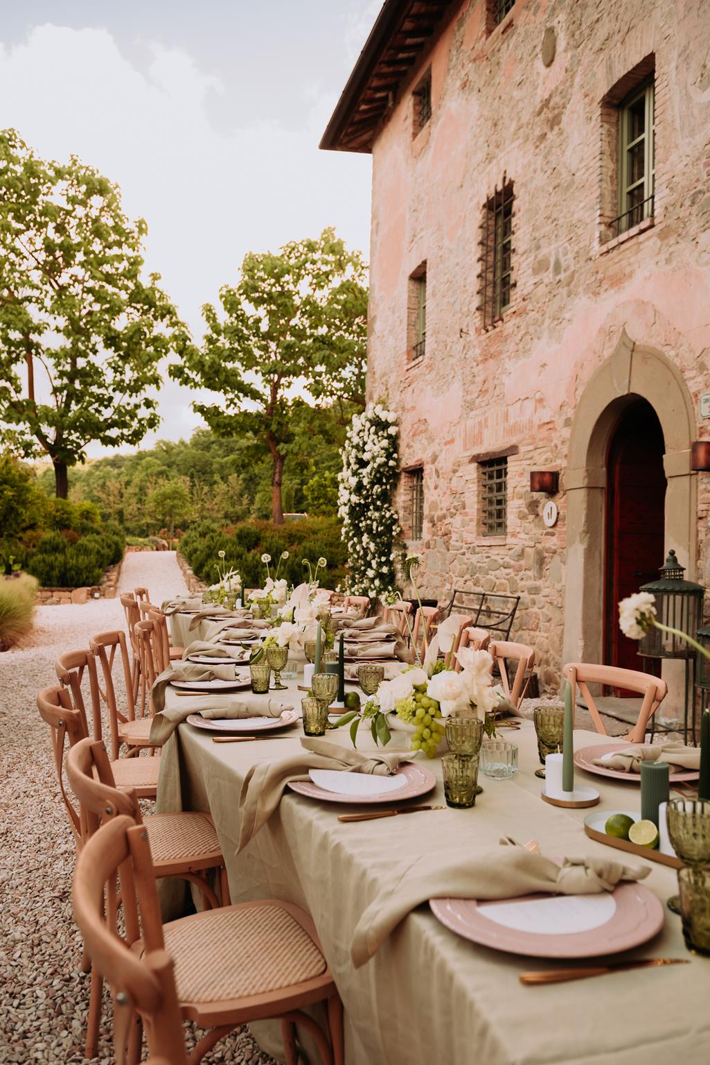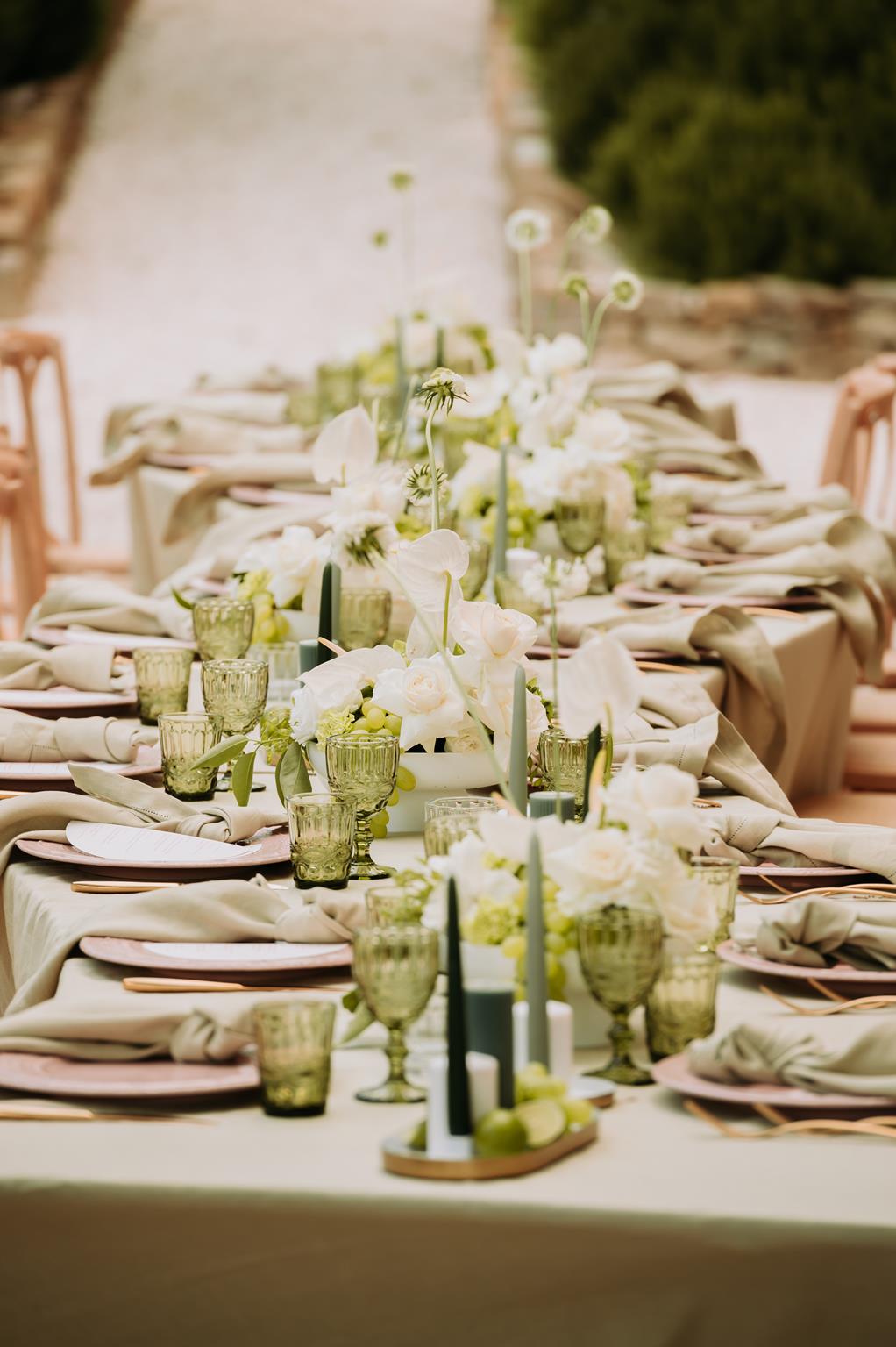 Nella magica cornice di Vocabolo Moscatelli, nel cuore dell’Umbria, questo shooting celebra l’eleganza della semplicità e il fascino della natura. La lunga tavola imperiale allestita all’aperto, tra pietra antica e giardini fioriti, si veste di tonalità delicate — verde salvia, blush e avorio — arricchite da fiori bianchi, uva fresca e vetri verde acqua. Un’atmosfera intima e raffinata, ispirata alla bellezza autentica della campagna umbra, perfetta per gli sposi che desiderano un matrimonio romantico, naturale e senza tempo